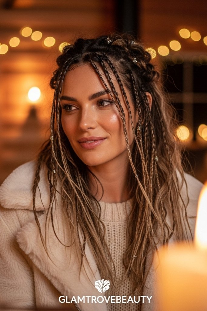 Boho braids with soft twists and face-framing strands give off a dreamy, romantic winter vibe. Add in tiny flowers or metallic clips for festive flair.