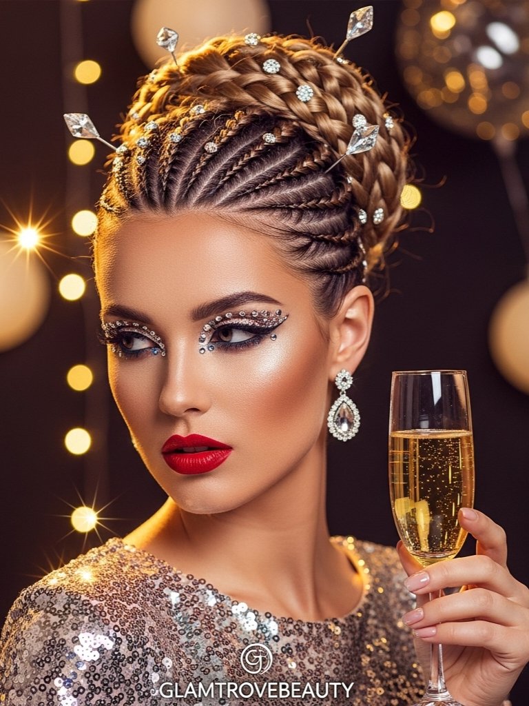 A braided updo or sleek Dutch braids add drama to your NYE look. Add rhinestones or gems for that midnight sparkle.