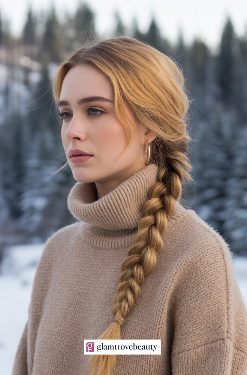 A classic French braid works beautifully with chunky sweaters and turtlenecks. It keeps hair neat against static-prone winter air while still looking elegant.