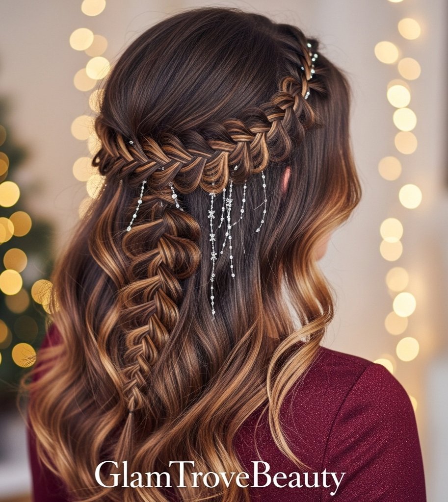 Think soft braids adorned with glitter, clips, or metallic hair ties. It’s festive but wearable.