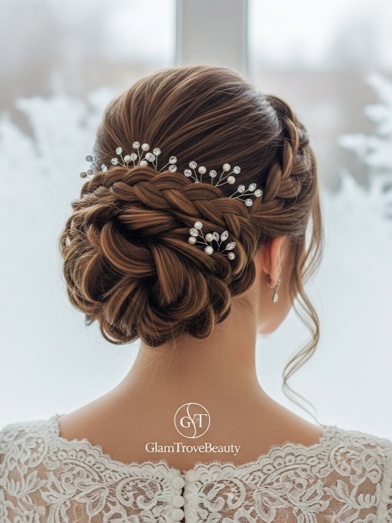 Braids twisted into an updo are elegant and timeless. They’re perfect for brides who want a romantic, winter-fairytale hairstyle.