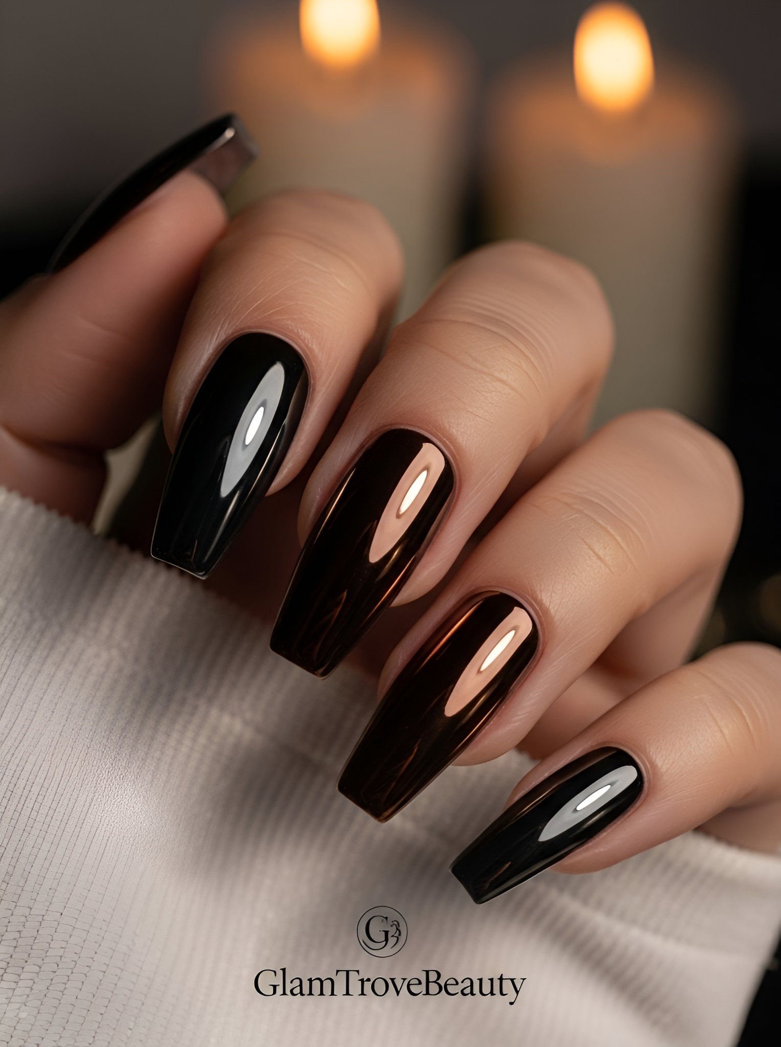 Dark chrome shades like gunmetal, chocolate, and bronze give off sultry vibes. Add a high-gloss top coat for a mirror-like shine.