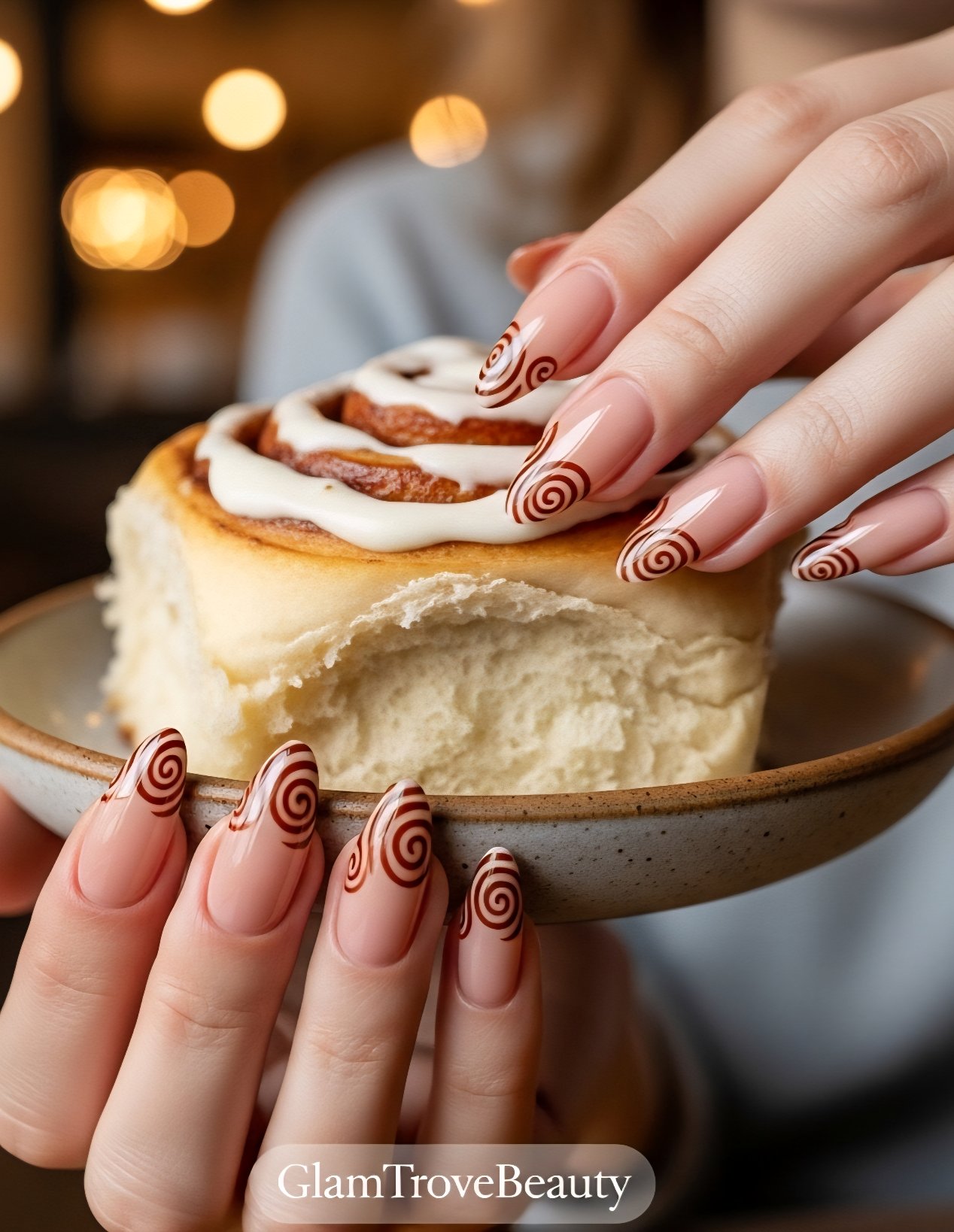 Like a cinnamon roll on your fingertips! Swirled nude and tan polishes mimic the look of cinnamon filling โ warm and delicious.