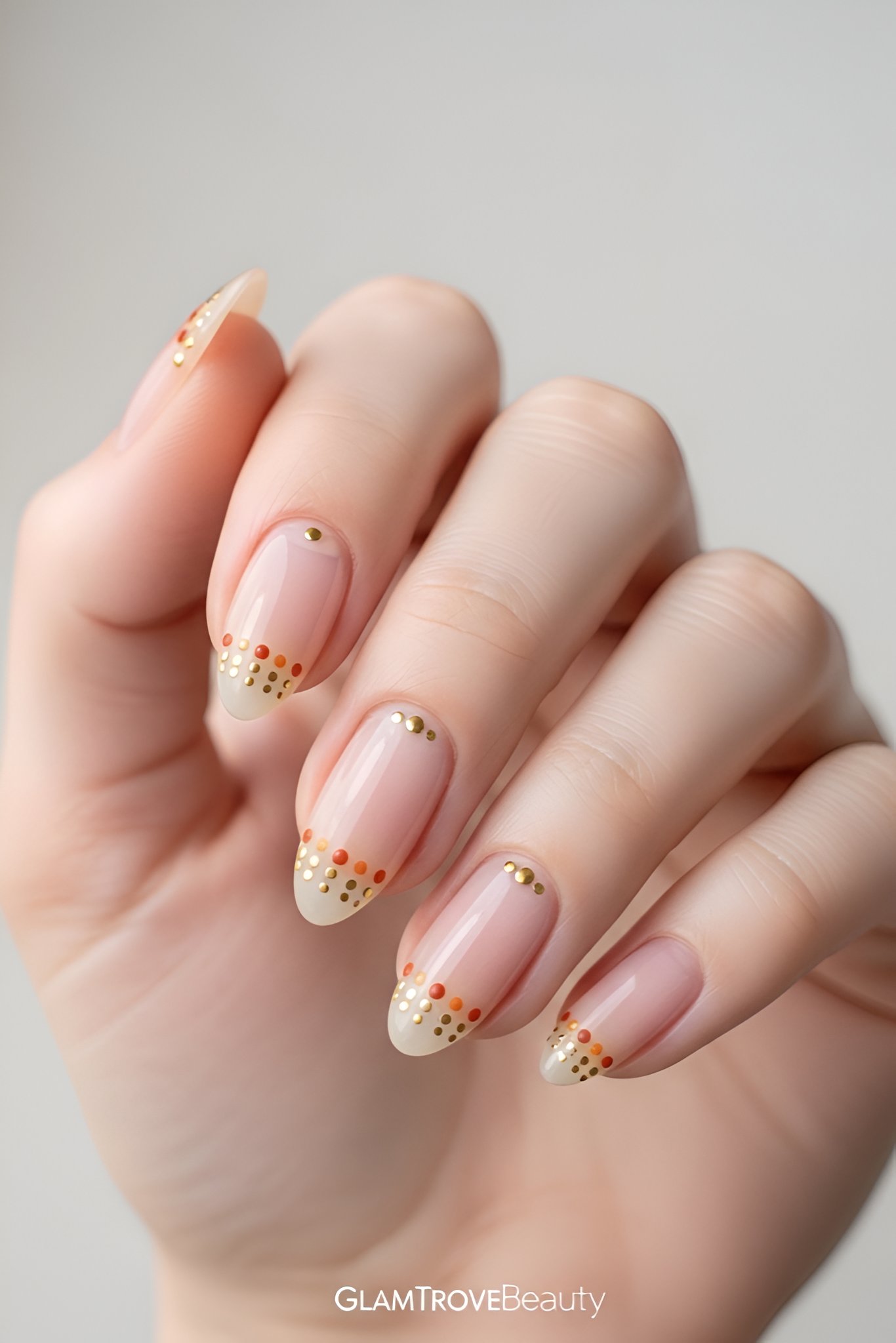 A nude or taupe base with tiny gold or burnt orange dots โ clean, artsy, and Pinterest-perfect for minimalist fall nail lovers.