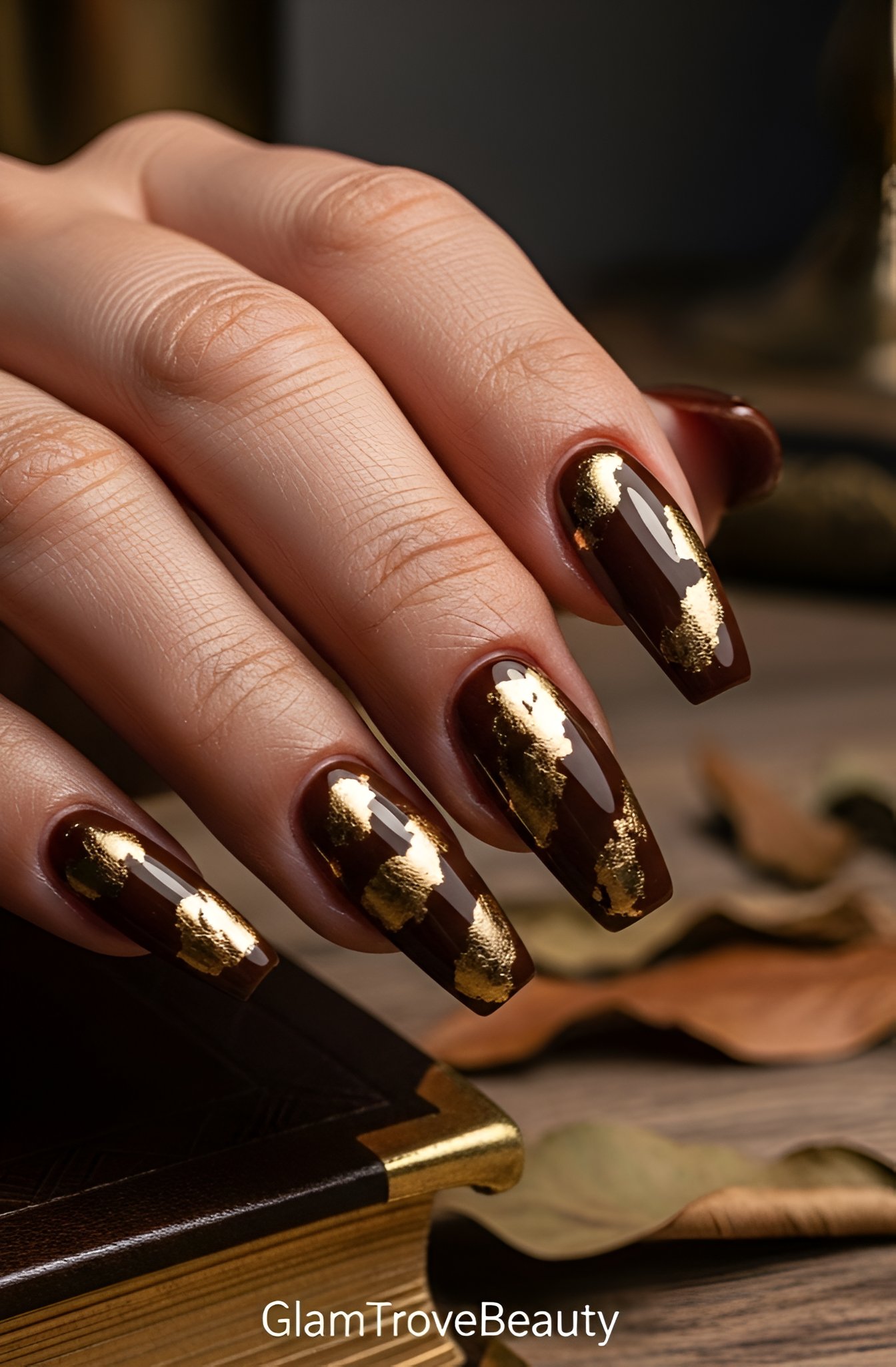 Rich chocolate brown meets shiny gold leaf in this sophisticated combo. Whether scattered or marbled, gold foil adds instant luxury to fall nails.