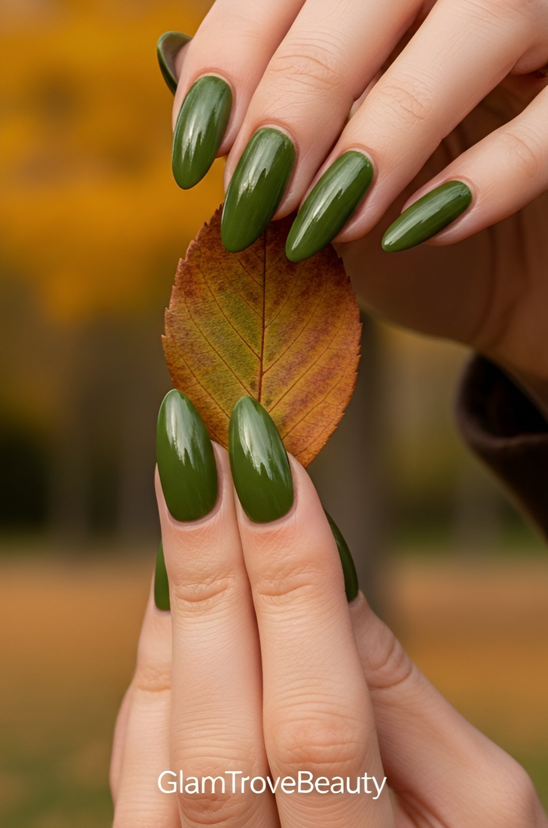 Earthy and versatile, olive green looks stunning on almond-shaped nails. It’s a muted tone that feels grounded yet glam โ ideal for both casual days and autumn nights out.
