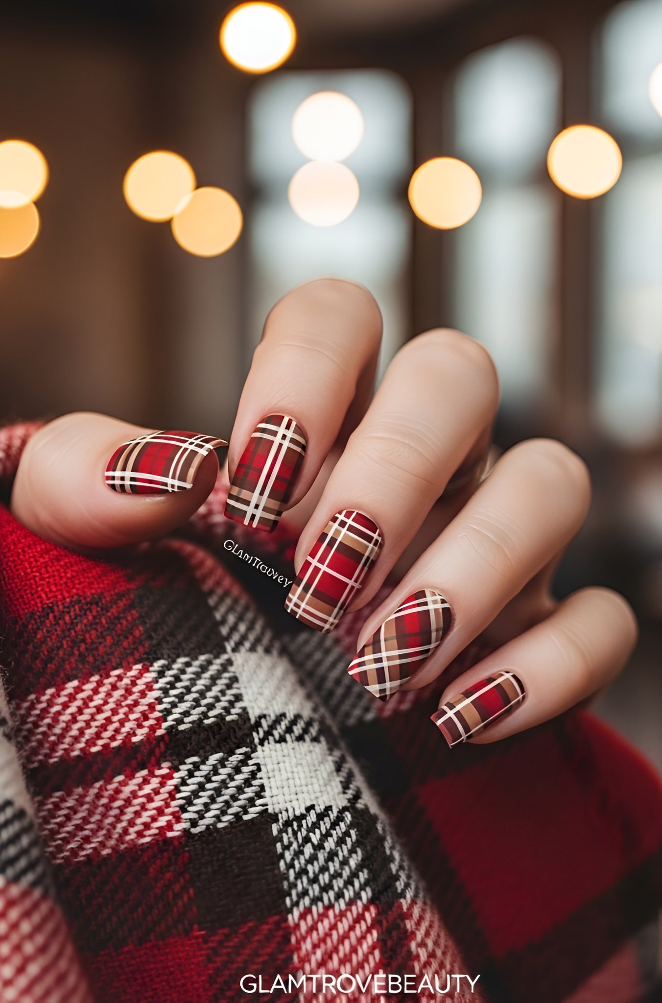 Channel cozy flannel shirts with plaid nail designs in red, brown, and cream. Itโs the perfect nostalgic nod to back-to-school and apple-picking season.